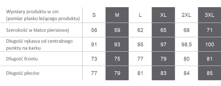 Podajemy uśrednioną wagę produktu, zwykle dla rozmiaru L. Waga innych rozmiarów, szczególnie rozmiarów dużych może znacznie odbiegać od podanej wartości. kurtki: ok. 1050 g